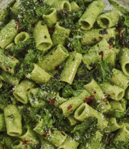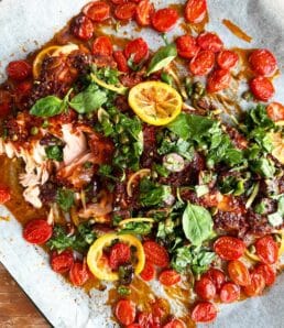 Tous nos légumes adorés rôtissent doucement à la plaque. Le pesto rosso qu’on ajoute à la fin de la cuisson vient confire le tout. Sûrement notre couplet préféré.