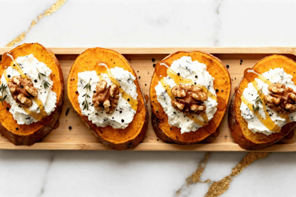 Des petites bouchées végétariennes à la patate douce rôtie, surmontées de chèvre fondant, de noix croquantes et d’un filet de miel pour apporter une touche sucrée-salée à votre apéritif de fête. C’est juste une histoire d’assemblage de couches et les bouchées à la patate douce sont sublimées en seulement 20 minutes de préparation !