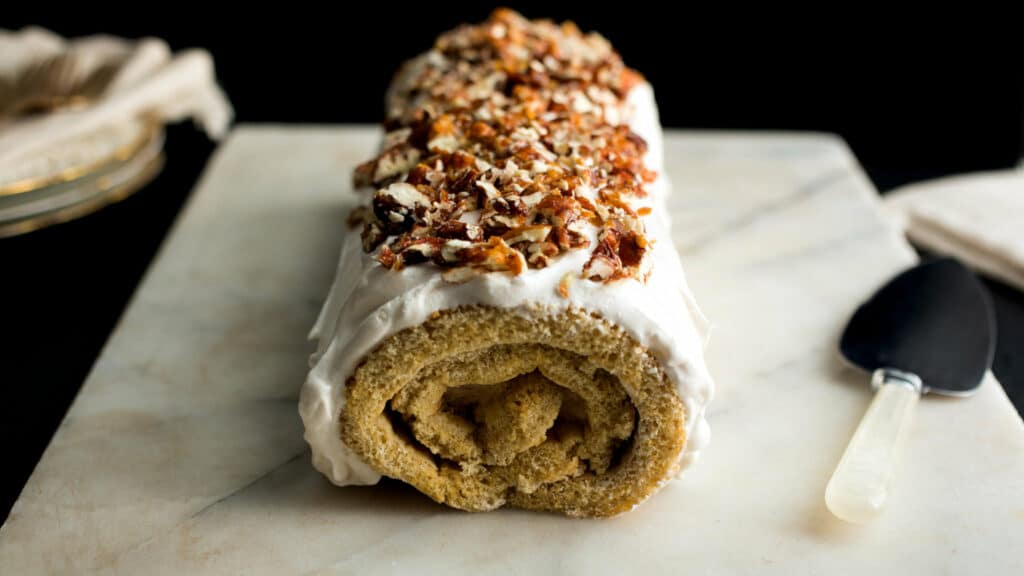 Pour le glaçage : Fouettez 115 g de beurre mou avec 1 cuillère à soupe d’extrait de vanille. Recouvrez la bûche de ce glaçage en lissant ou en dessinant des stries à la fourchette, selon l’effet souhaité. Réservez au frais jusqu’au moment de servir. Saupoudrez éventuellement de sucre glace ou de quelques éclats de noix de pécan avant de déguster.