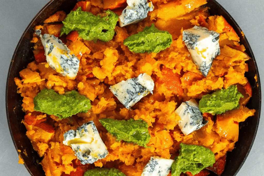 Une fois les morceaux de potiron cuits, placez-les dans une poêle ou un plat allant au four. Écrasez-les légèrement, puis disposez dessus quelques dés de gorgonzola, des cuillères de pesto, un filet d’huile d’olive et beaucoup de crumble.