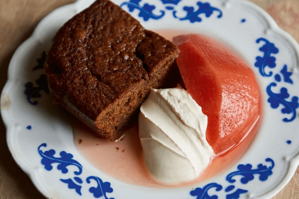 Laissez refroidir 15 minutes avant de découper. Servez tiède, avec de la crème fraîche, des coings pochés et un généreux filet de sirop.
