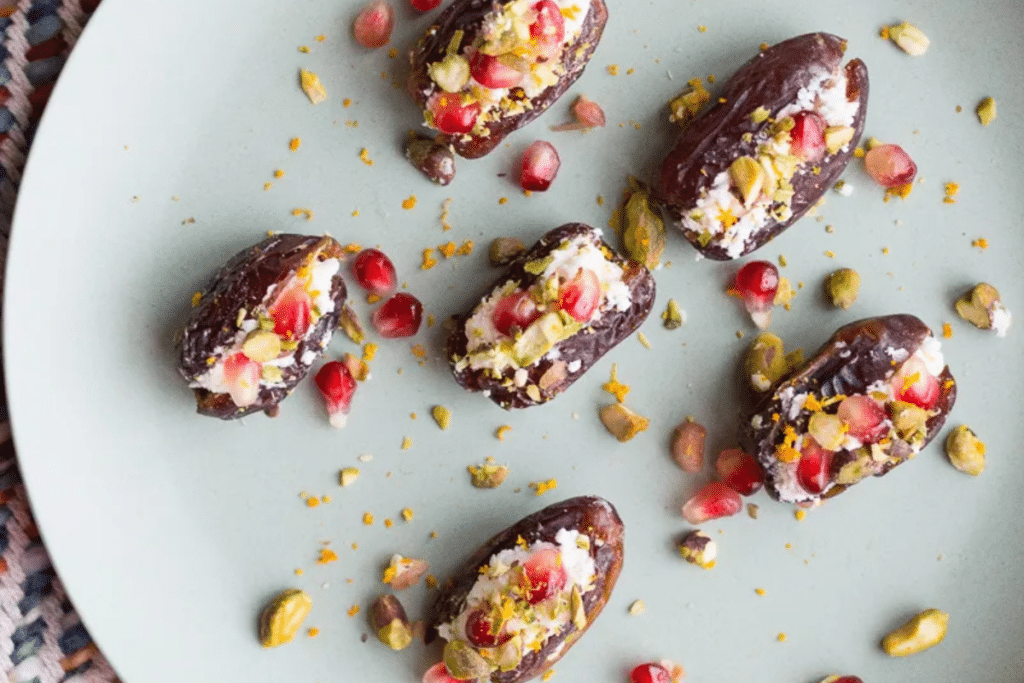 Une recette zéro cuisson, qui ne demande presque aucune préparation : une datte coupée en deux, farcie de chèvre, puis décorée de zeste de citron, de pistaches et de graines de grenade. Un doux mélange fondant où la sucrosité de la datte, la puissance du fromage et l’acidité des fruits s’équilibrent parfaitement.