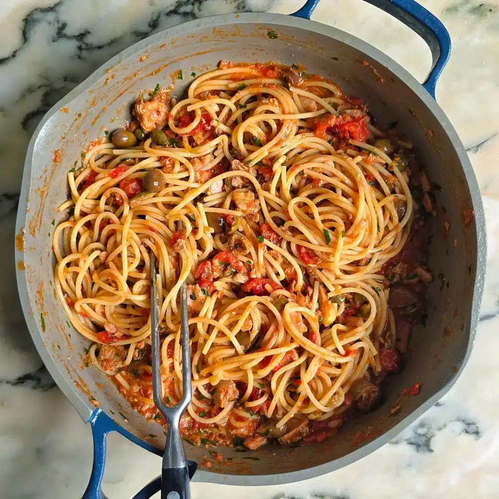 Dans la sauteuse, versez la sauce tomate. Salez légèrement (les olives et câpres apportent déjà du sel) et poivrez. Ajoutez un peu d’eau de cuisson des pâtes, cela permet également de récupérer le fond de tomate resté dans la boîte.