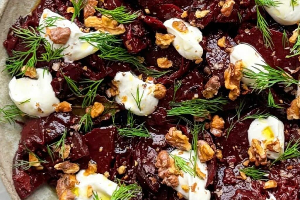 Disposez les betteraves dans une assiette, ajoutez le fenouil cru et les noix grillées. Nappez de sauce au yaourt et terminez par un filet d’huile d’olive et quelques brins d’aneth.
